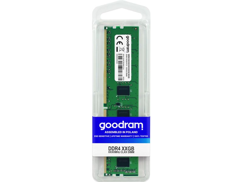Goodram GR3200D464L22S/8G. Componente per: PC/server, Memoria Interna: 8 GB, Configurazione della memoria (moduli x dimensione): 1 x 8 GB, Tipo di RAM: DDR4, Velocità memoria: 3200 MHz, Fattore di forma memoria: 288-pin DIMM, Latenza CAS: 22