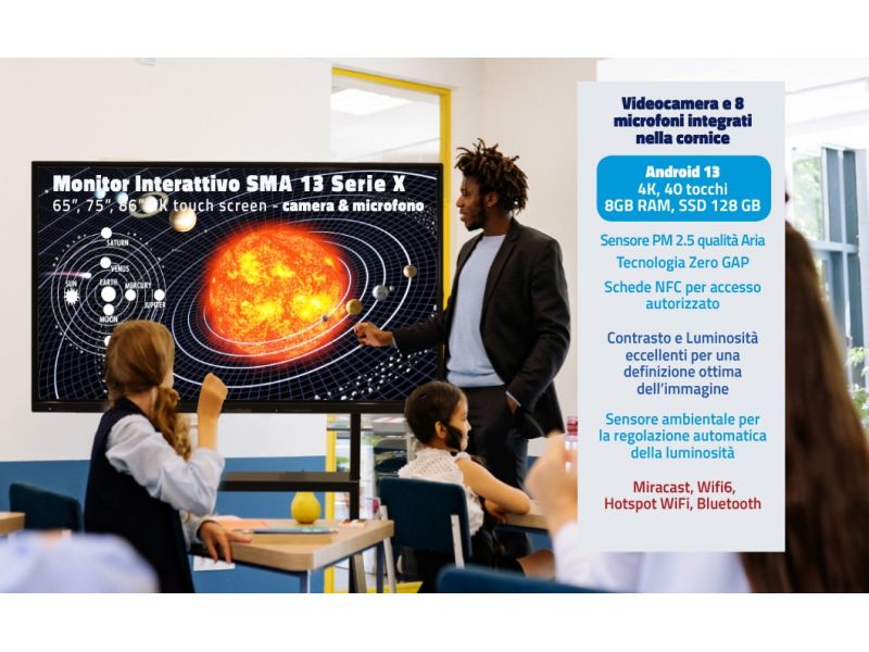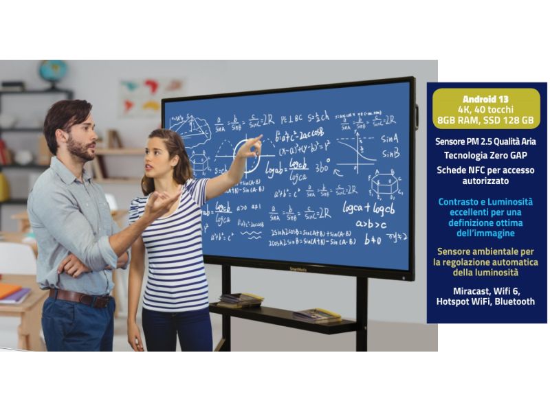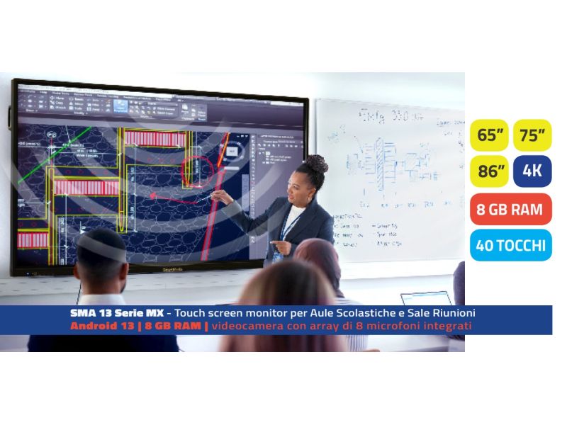 Monitor Touch Interattivo SmartMedia serie MX da 75" uhd 4K con videocamera full hd e 8 microfoni integrati Wi-Fi ram 8gb Android 13 multilingua