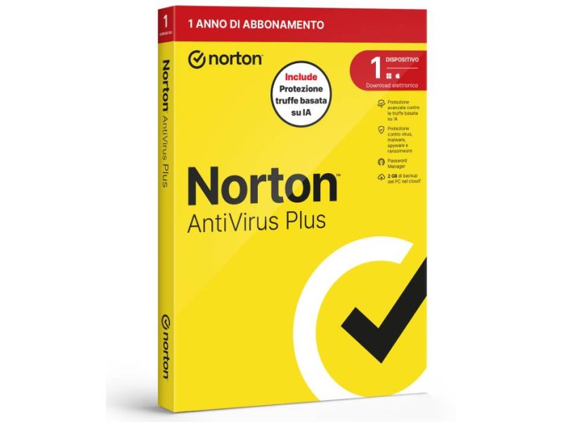Norton Antivirus Plus 2026 con funzione Antitruffa licenza per 1 Dispositivo durata 12 Mesi spazio cloud 2GB versione Box