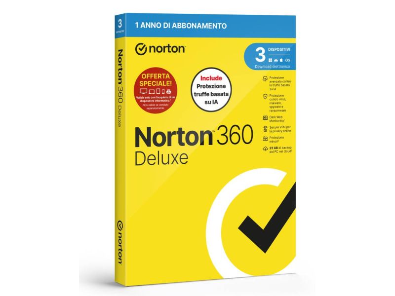 Norton Antivirus 360 DeLuxe 2026 con funzione Antitruffa licenza per 3 Dispositivi durata 12 Mesi spazio cloud 25GB versione Box